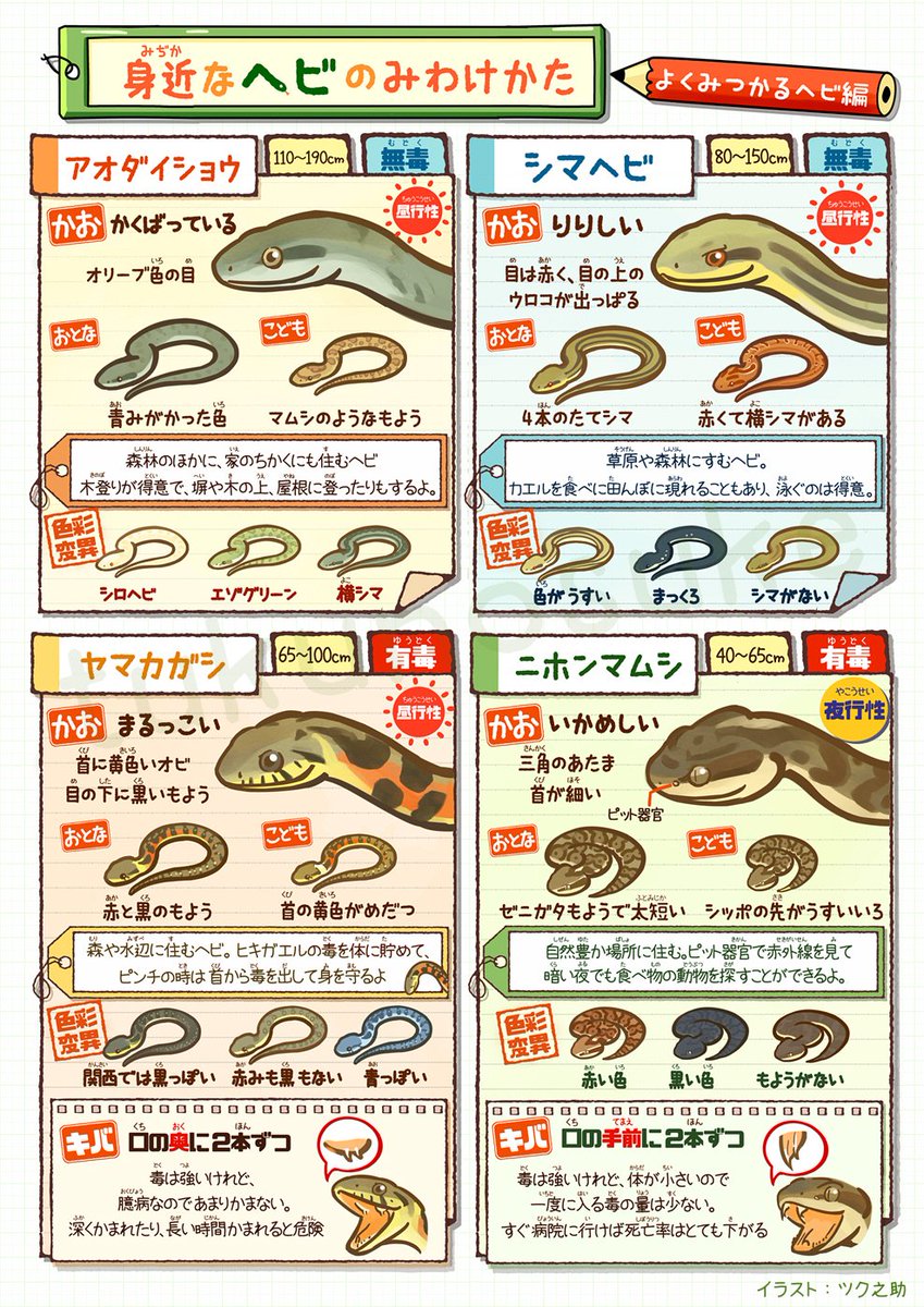 身近なヘビの見分け方 イラスト解説が可愛いうえにめっちゃ分かりやすい ヘビは色の変化が大きい Togetter